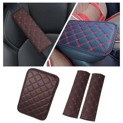 Econour 1pc Center Console Armrest Pad 2 Pieces Seat Belt Pad, Universal Car Armrest Cover Fit Car Accessories Red Check Armrest and Belt Cover (Combo)