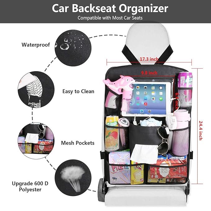 Car Back Seat Organizer Foldable Car Storage Organizer Car Seat Back Protectors with Hole for USB/Headphone/Charging Kick Mats Back Seat Protector with Touch Screen Tablet Holder Tissue Box