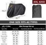 • Large Size – 420D-XL for 1 or 2 bikes: 79” L x 32” W x 43” H, easily cover 1 or 2 bike up to 29″ wheel size, provide full protection for your bike, protect your bike from dust, dirt, sun, rain, UV and pollutants(If you have two larger bikes, we recommend that you select “420D-XXL for 3 bikes”)